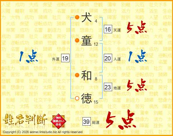 犬(4画)童(12画) 和(8画)徳(15画)