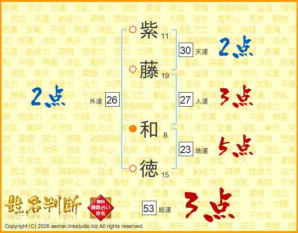 紫(11画)藤(19画) 和(8画)徳(15画)