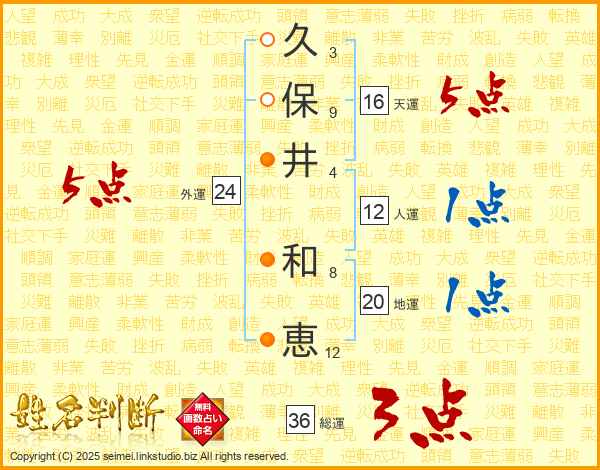久(3画)保(9画)井(4画) 和(8画)恵(12画)