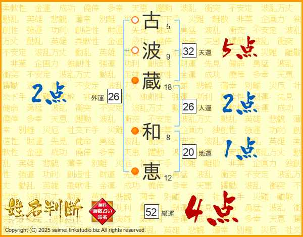 古(5画)波(9画)蔵(18画) 和(8画)恵(12画)
