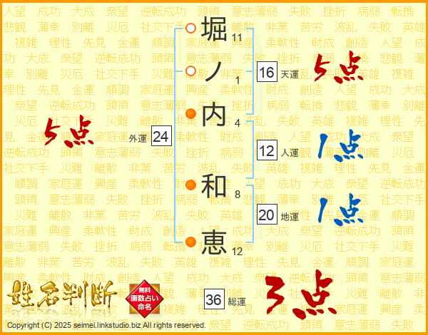 堀(11画)ノ(1画)内(4画) 和(8画)恵(12画)