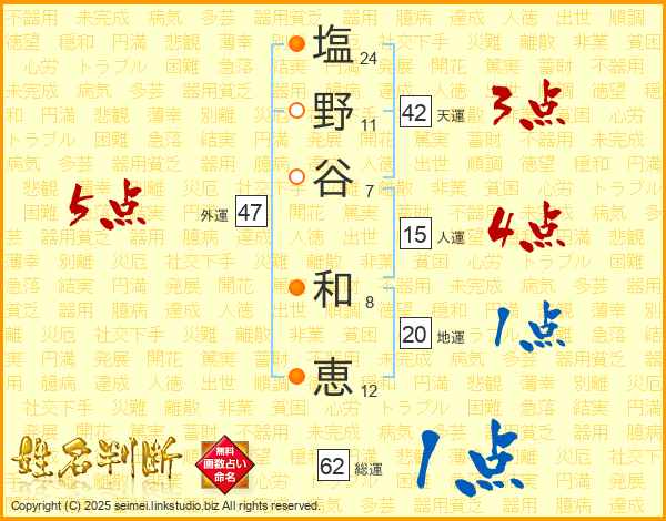 塩(24画)野(11画)谷(7画) 和(8画)恵(12画)