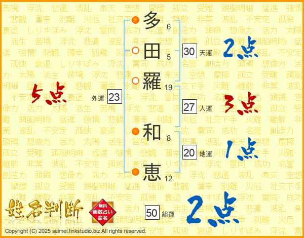 多(6画)田(5画)羅(19画) 和(8画)恵(12画)