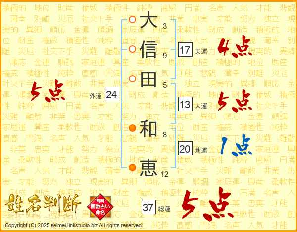 大(3画)信(9画)田(5画) 和(8画)恵(12画)