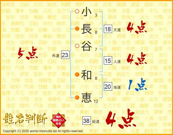 小(3画)長(8画)谷(7画) 和(8画)恵(12画)