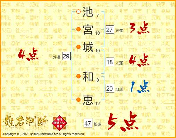 池(7画)宮(10画)城(10画) 和(8画)恵(12画)