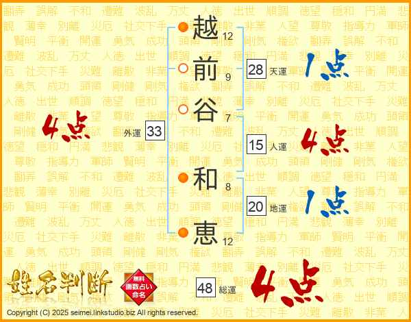 越(12画)前(9画)谷(7画) 和(8画)恵(12画)