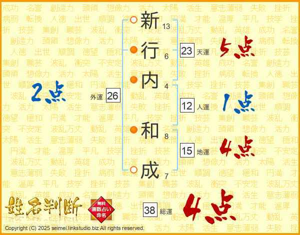 生活面を象徴する運勢です。外部から受ける影響力を表し、結婚運、家庭運や職場、環境への順応性を表します。総運から人運を引いた画数。姓や名が1文字の場合を除く。