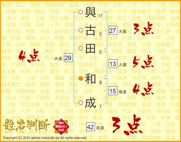 與(17画)古(5画)田(5画) 和(8画)成(7画)