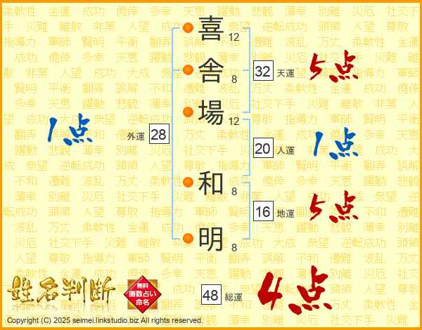 喜(12画)舎(8画)場(12画) 和(8画)明(8画)