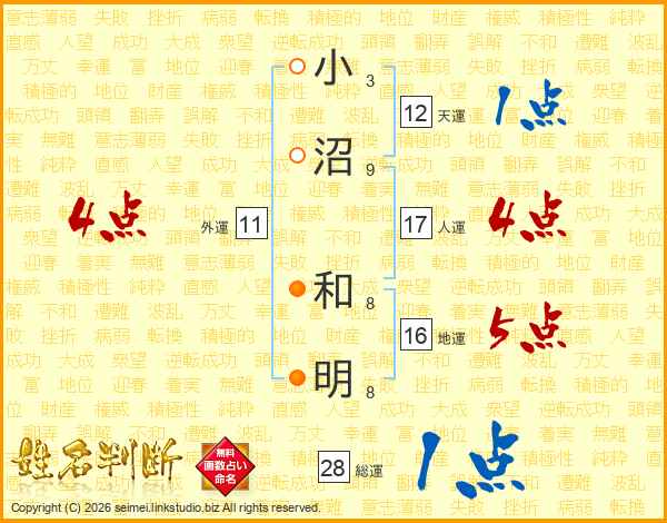 生活面を象徴する運勢です。外部から受ける影響力を表し、結婚運、家庭運や職場、環境への順応性を表します。総運から人運を引いた画数。姓や名が1文字の場合を除く。