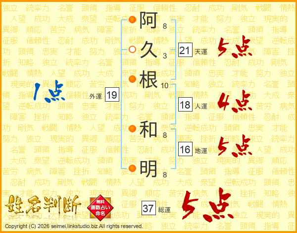 阿(8画)久(3画)根(10画) 和(8画)明(8画)