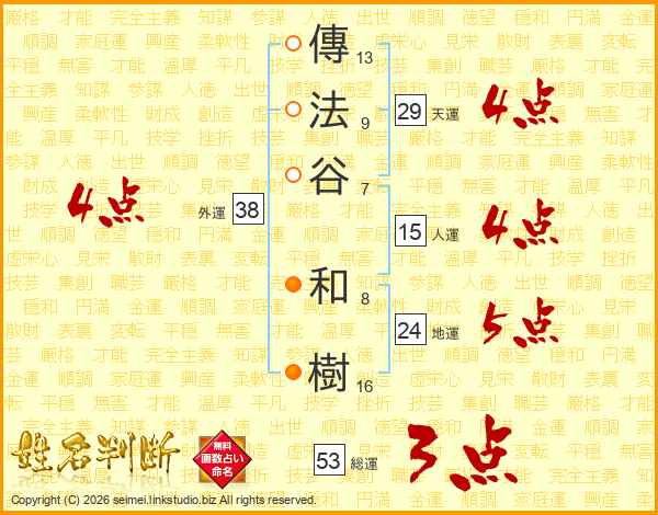 傳(13画)法(9画)谷(7画) 和(8画)樹(16画)