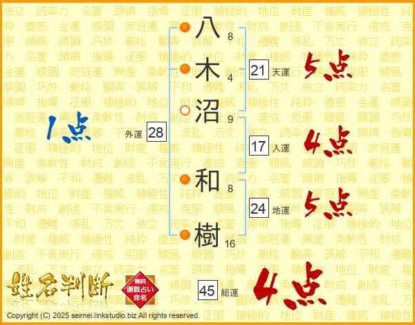 八(8画)木(4画)沼(9画) 和(8画)樹(16画)