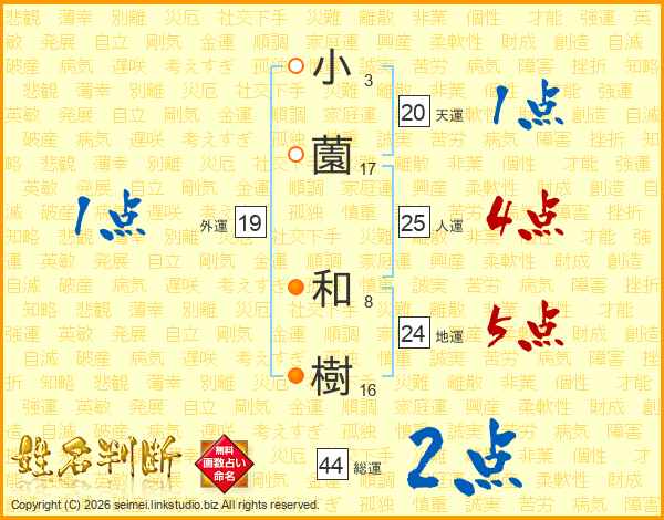 生活面を象徴する運勢です。外部から受ける影響力を表し、結婚運、家庭運や職場、環境への順応性を表します。総運から人運を引いた画数。姓や名が1文字の場合を除く。