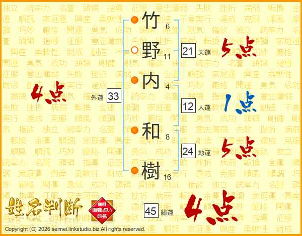 竹(6画)野(11画)内(4画) 和(8画)樹(16画)