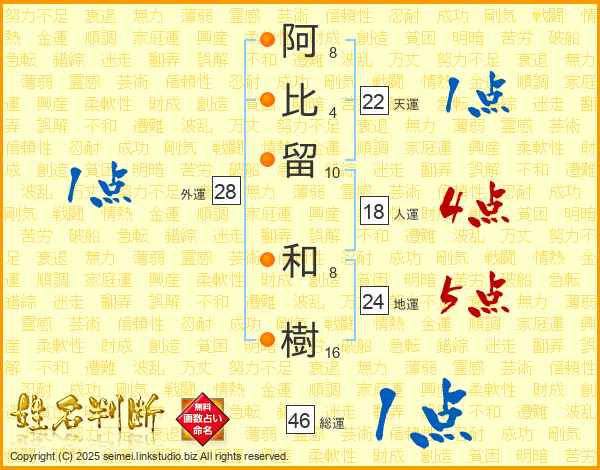 阿(8画)比(4画)留(10画) 和(8画)樹(16画)