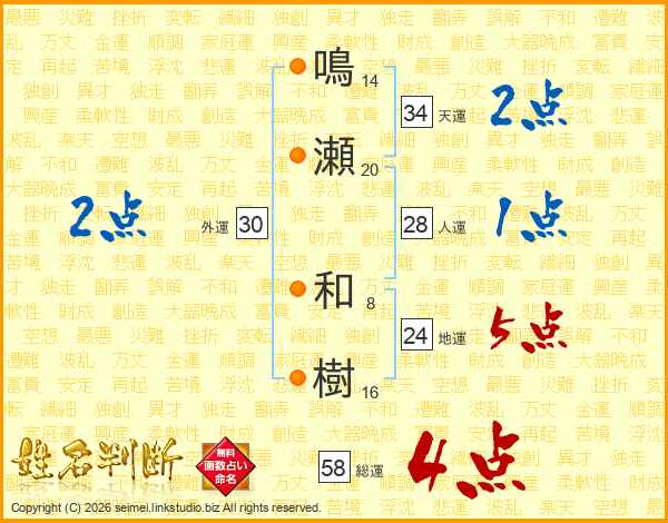鳴(14画)瀬(20画) 和(8画)樹(16画)