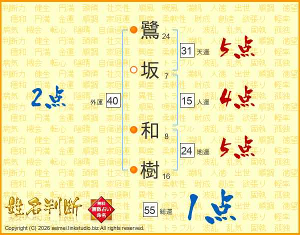 鷺坂和樹さんの総運は55画の1点!