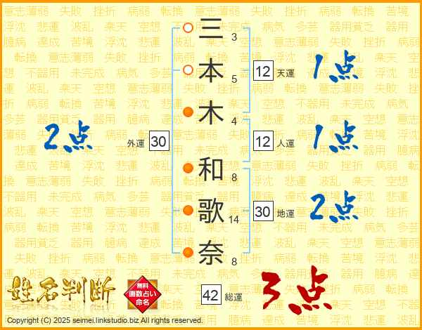 三(3画)本(5画)木(4画) 和(8画)歌(14画)奈(8画)