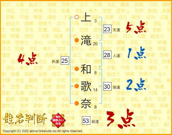 上(3画)滝(20画) 和(8画)歌(14画)奈(8画)