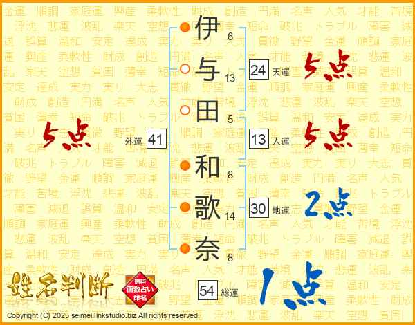 伊(6画)与(13画)田(5画) 和(8画)歌(14画)奈(8画)