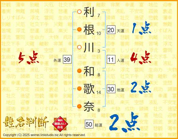 利(7画)根(10画)川(3画) 和(8画)歌(14画)奈(8画)