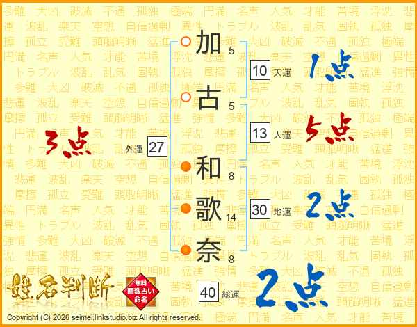 加(5画)古(5画) 和(8画)歌(14画)奈(8画)