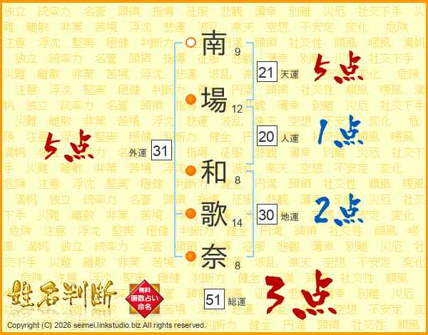 南(9画)場(12画) 和(8画)歌(14画)奈(8画)