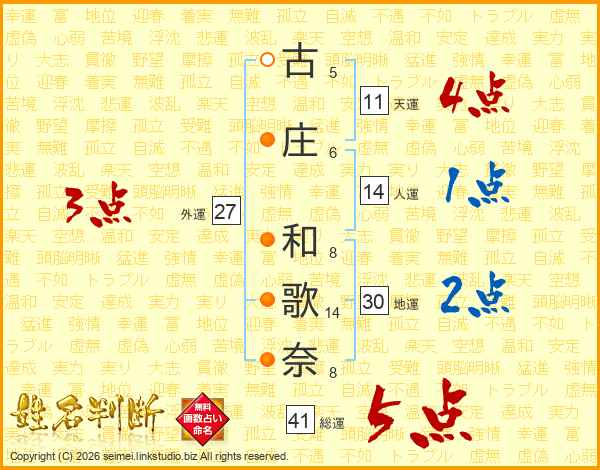 古(5画)庄(6画) 和(8画)歌(14画)奈(8画)
