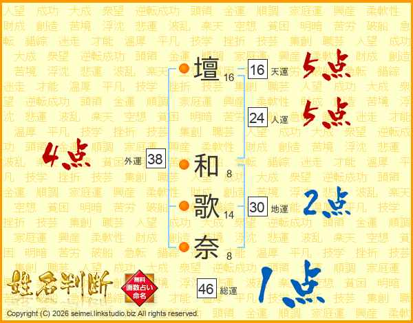 壇(16画) 和(8画)歌(14画)奈(8画)