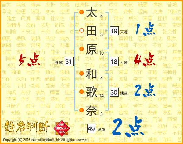 太(4画)田(5画)原(10画) 和(8画)歌(14画)奈(8画)