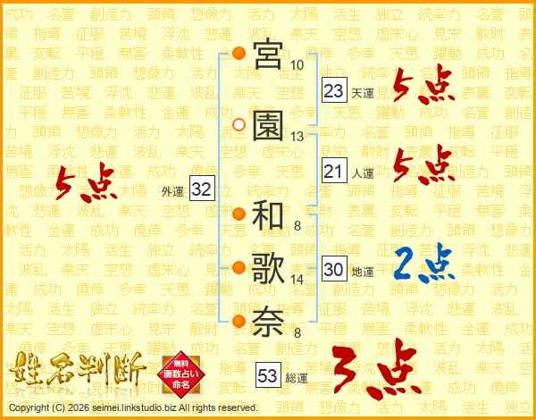 宮(10画)園(13画) 和(8画)歌(14画)奈(8画)