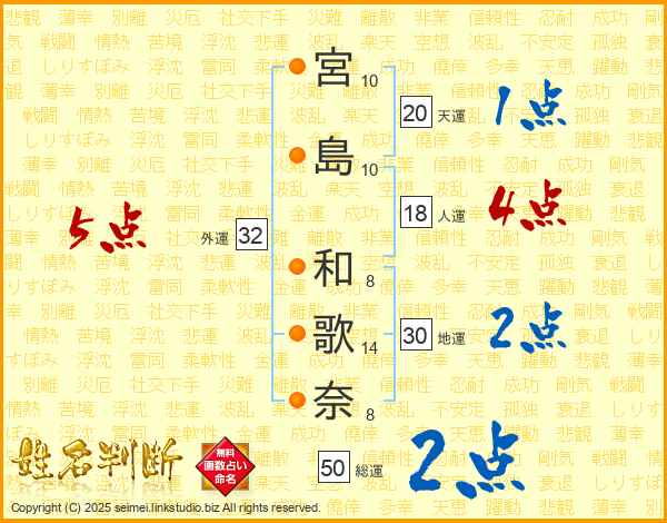 宮(10画)島(10画) 和(8画)歌(14画)奈(8画)