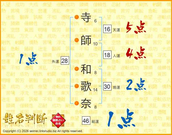 寺(6画)師(10画) 和(8画)歌(14画)奈(8画)