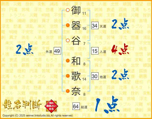 御(11画)器(16画)谷(7画) 和(8画)歌(14画)奈(8画)