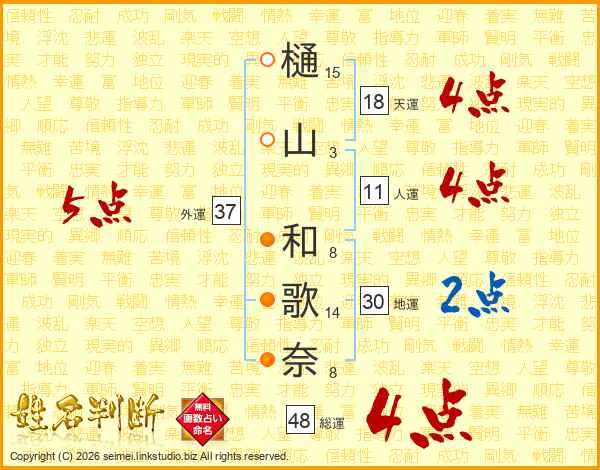 樋(15画)山(3画) 和(8画)歌(14画)奈(8画)
