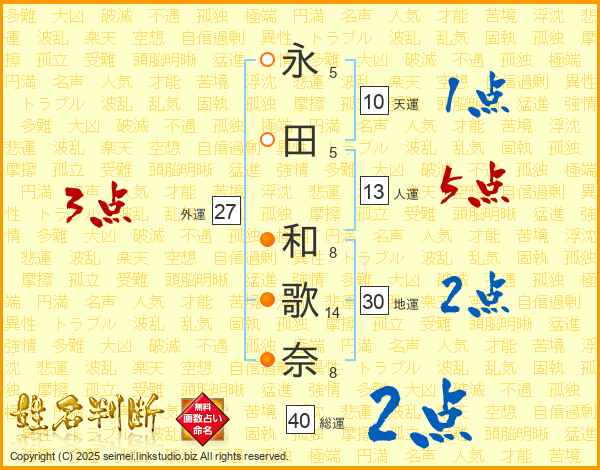 永(5画)田(5画) 和(8画)歌(14画)奈(8画)