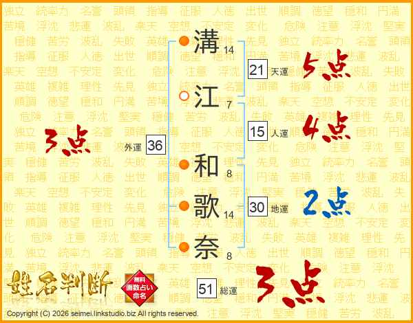 溝(14画)江(7画) 和(8画)歌(14画)奈(8画)