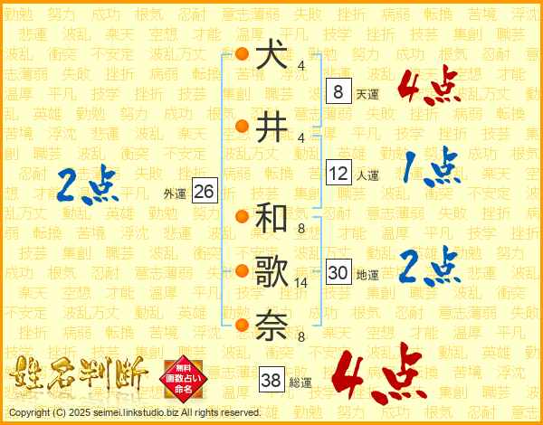 犬(4画)井(4画) 和(8画)歌(14画)奈(8画)
