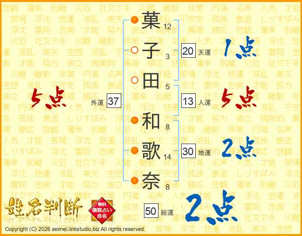 菓(12画)子(3画)田(5画) 和(8画)歌(14画)奈(8画)