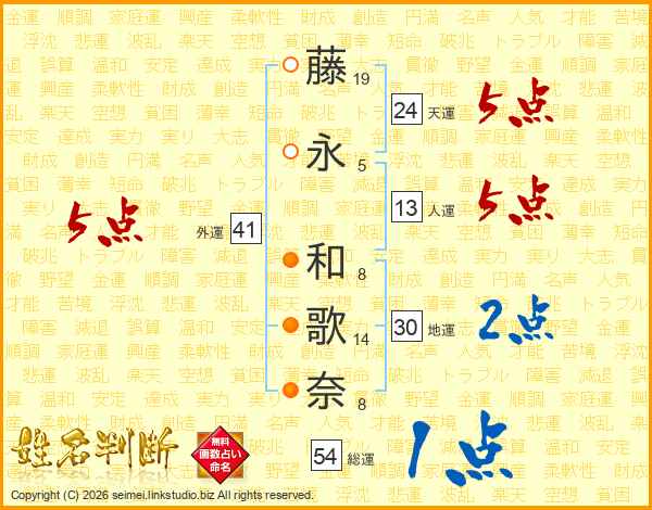 藤(19画)永(5画) 和(8画)歌(14画)奈(8画)