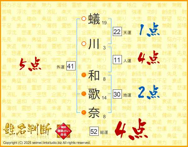 蟻(19画)川(3画) 和(8画)歌(14画)奈(8画)