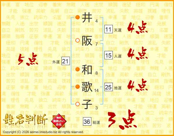 井(4画)阪(7画) 和(8画)歌(14画)子(3画)