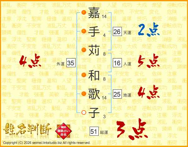 嘉手苅和歌子さんの天運は26画の2点!