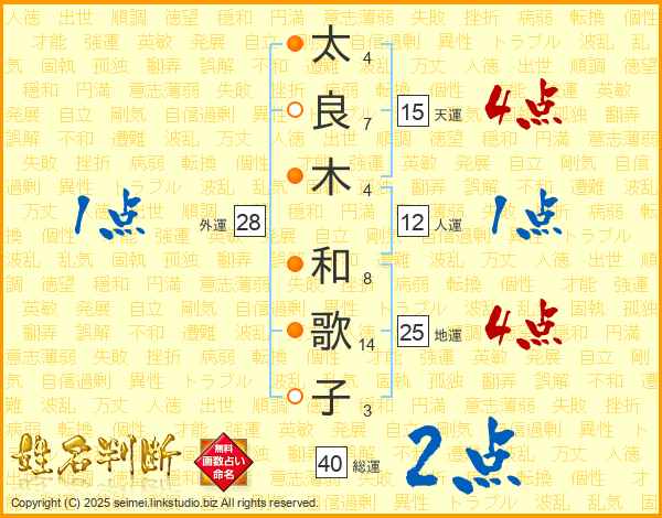 太(4画)良(7画)木(4画) 和(8画)歌(14画)子(3画)