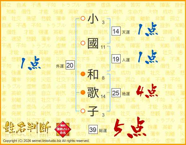 生活面を象徴する運勢です。外部から受ける影響力を表し、結婚運、家庭運や職場、環境への順応性を表します。総運から人運を引いた画数。姓や名が1文字の場合を除く。