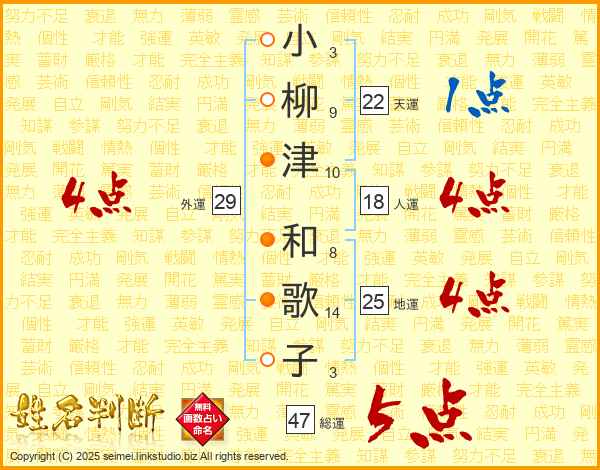 小(3画)柳(9画)津(10画) 和(8画)歌(14画)子(3画)