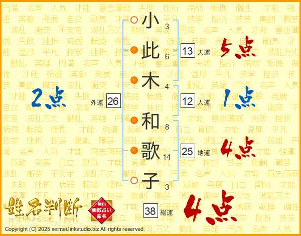 小(3画)此(6画)木(4画) 和(8画)歌(14画)子(3画)