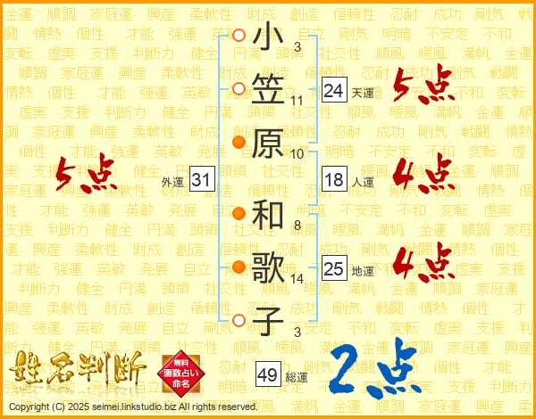 生活面を象徴する運勢です。外部から受ける影響力を表し、結婚運、家庭運や職場、環境への順応性を表します。総運から人運を引いた画数。姓や名が1文字の場合を除く。